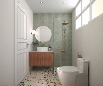 极简主义风格浴室设计,柔和的米白色墙面,温暖的自然光透过白色窗帘洒入,形成柔和的光影效果,地面铺设浅色大理石瓷砖,中央放置一个造型简约的独立式白色浴缸,黄铜色金属水龙头,浴缸旁地面随意摆放一条浅灰色柔软毛巾,右侧角落有一盆绿色植物置于编织篮中,整体氛围宁静、优雅、舒适,布局简洁开阔,空间感强,材质质感细腻,色彩和谐统一,营造出高级而温馨的沐浴环境。