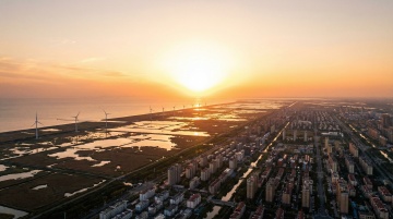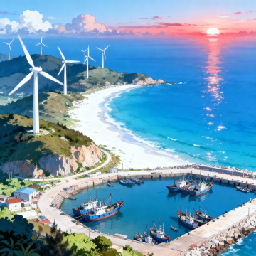 帮我生成一张南澳岛的图片,体现潮汕当地的风景观光,1. 潮汕南澳岛海滨风光,蓝天碧海,白色风车矗立在环岛公路旁,沙滩上有游客散步,远处渔船点点,清新自然,
