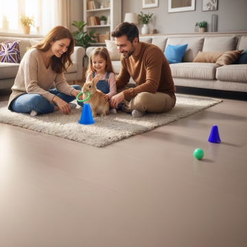现代温馨家庭场景,一位25岁的孕妇坐在客厅地毯上看书,身穿米色长袖,双手拿着展开的书籍近距离看,眼睛视线对齐书籍,亚洲女性。旁边儿童在地上玩耍,大落地窗连接城市远景。屋内光线柔和,空气中弥漫着淡淡的蜜糖水甜味,营造出宁静、温馨、充满爱意的氛围