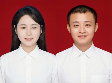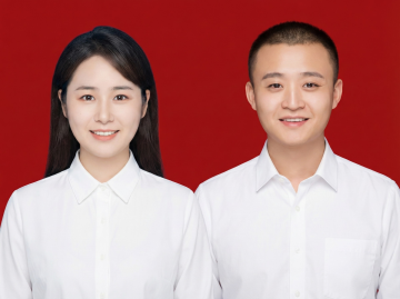 制作一张结婚登记照风格的图片,要求画面清晰、正式 。 画面中女生在左男生在右,女性五官发型保持不变穿着白色衬衣;男性五官发型保持不变穿着白色衬衫。背景为红色 。