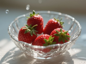 一堆新鲜饱满的草莓,表面覆盖着晶莹的水珠,散发着诱人的光泽,草莓的叶子呈现出鲜亮的绿色,背景为红色,整体画面色彩鲜艳,充满了生机与活力,具有高度的写实感和细腻的质感表现,光影效果突出,营造出一种新鲜、美味的氛围。