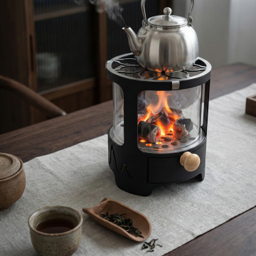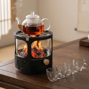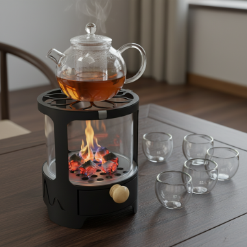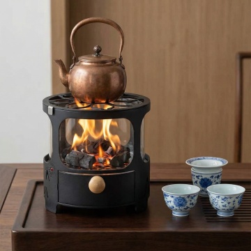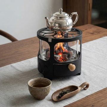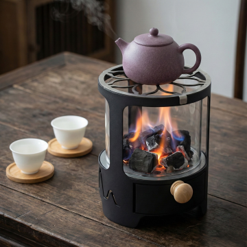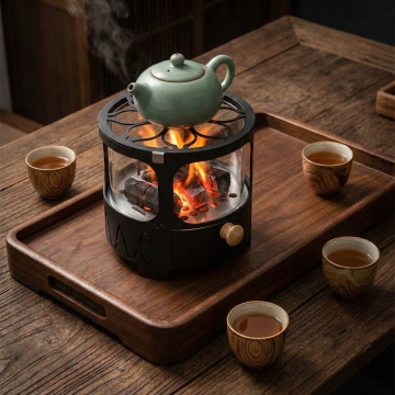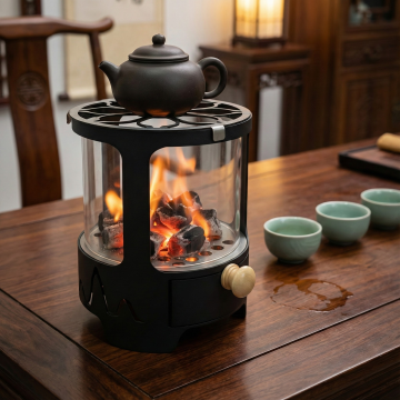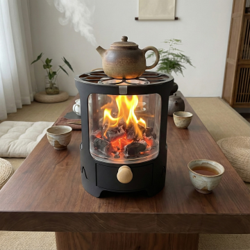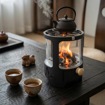 炉子本体不能被改动,背景是喝茶,炉子在大的深色茶桌上面,炉子边上放几个茶杯,炉子里面有一些木碳在燃烧(有明细的火焰),炉子上有一个茶壶在烧着,设计10张不一样的图,