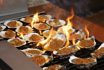 中式感实景美食,质朴木质桌面搭配鎏金铜锅,重拟物风呈现鲜嫩生蚝与暖焰,东亚风温馨氛围,金属光泽点缀节日宴席。
