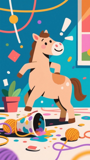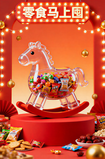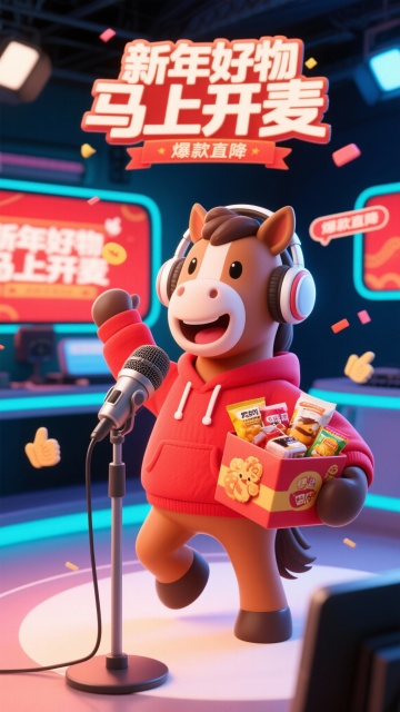 软3D风格萌马拟人化,毛发生长质感,喜庆红灯笼与彩带烘托节日氛围,卡通感十足,趣味对话强化产品脆感体验。