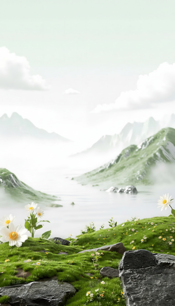 全景镜头,在被晨雾温柔笼罩的隐秘山谷中,翡翠色的草甸如波浪般起伏延伸,轻薄的乳白色雾气在草叶间流动缠绕,仿佛大地正在缓缓呼吸。一条银色溪流如时间的脉络蜿蜒穿行其间,水面倒映着紫粉色渐变的朝霞与靛青色的远山轮廓,形成虚实交织的双重梦境。两岸点缀着无数露珠闪烁的白色小花,每一朵都像是被晨雾吻过的星辰。远处山峦在玫瑰金色的晨光中若隐若现,空气中弥漫着湿润的草木清香与泥土芬芳。光线柔和得如同被丝绸过滤,既保留了3D渲染的精致细节——草叶的纹理、露珠的折射、水面的微澜,又透着水彩画般的诗意朦胧。整体色调呈现青绿色草甸与玫瑰金霞光的绝美渐变,营造出神秘而又充满希望的黎明之境,仿佛世界在此刻刚刚苏醒,一切皆有可能。