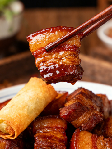 一张白色圆形瓷盘盛放的中式菜肴,菜品色泽红亮诱人,表面覆盖光泽感的酱汁,点缀细小的红色辣椒碎,食材形态自然堆叠,具有清晰的质感和细节,纯色白色背景,简约现代风格,整体构图规整居中,无任何文字、logo或水印
