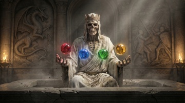 酷炫感与卡通感交织,骷髅骑士骑乘蓝焰幽灵马,手持双剑,紫色披风飘扬,四周金币飞舞,插画风融合哥特风格与霓虹灯风,神秘而热血。