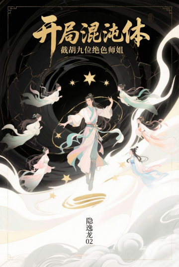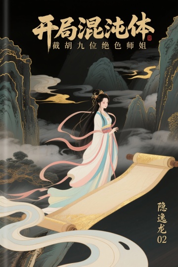 制作一个仙侠小说封面,书名:“开局混沌体,截胡九位绝色师姐”,笔名:“隐逸龙02”。全部书名在封面上大一点