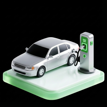 未来感与科技感交织的微缩艺术风设计,清透玻璃质感搭配软3D造型,展现智能充电场景,蓝色光效呼应新能源主题。