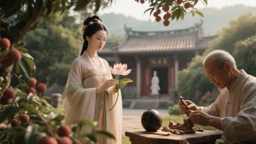 州增城美食大赏,前景是挂绿荔枝、丝苗米饭、,正果馄饨,派潭烧鸡,中景是客家妇女制作榄角,背景是增江日落,温暖的食物摄影风格,焦点清晰,景深效果,令人垂涎欲滴的光影,美食海报