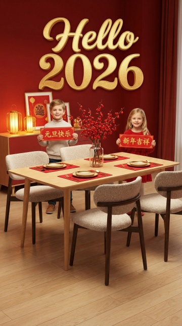 以正红为底色,画面主体是摆满除夕佳肴的红漆圆桌(占画面三分之二位置):碗装元宝饺子、盘盛红烧全鱼、蒸笼码着红糖年糕,旁侧摆着啤酒杯与油焖小龙虾;点缀红绸餐布、金元宝摆件、悬垂灯笼等吉祥元素;上方金色毛笔大字 “除夕团圆”,旁配 “2026”“HAPPY NEW YEAR”;左右侧竖排 “新年快乐”;海报底部金色横排极小字 “桌满佳肴 阖家欢宴”;整体红火热闹,传递除夕团圆纳福的祈愿。