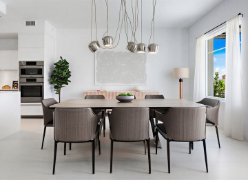 明亮通透的现代简约风格餐厅内部场景,以白色和浅木色为主色调,自然光透过大面积落地窗洒入室内,天花板悬挂着线条简洁的几何形白色吊灯,中央区域摆放着铺有浅色亚麻桌布的圆形餐桌,搭配浅灰色布艺餐椅,餐桌中央点缀着小型绿植花艺,靠墙设置悬浮式浅木色餐边柜,陈列着精致的玻璃器皿,角落处放置一个造型简约的藤编花瓶,插有几支白色和浅粉色的长茎鲜花,地面铺设浅色木地板,整体空间干净整洁、温馨舒适,充满自然清新的气息。