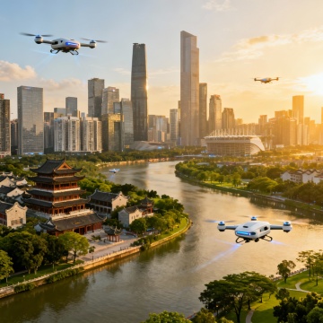 简约现代风格的无人机产品展示图,单架无人机居中规整排布,纯色背景,无任何文字、logo和水印。无人机采用金属灰为主色调,机身线条流畅,细节精致,配备四个螺旋桨和前置摄像头,底部有绿色指示灯。整体画面干净利落,光影柔和,突出无人机的科技感和现代设计美学。