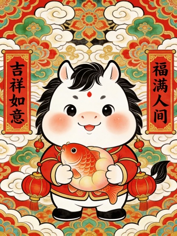 国潮风插画,拟人化小马手持金鱼,红金配色喜庆吉祥,剪纸与水彩元素融合,传递春节福满人间的可爱祝福。
