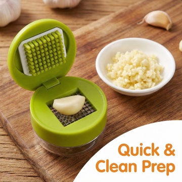 以图中的碎蒜器为元素,设计6张跟碎蒜器有关的广告图,物体主体特征不变,英语,比例 「1:1」