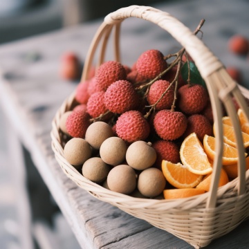 一个装满新鲜荔枝的浅棕色藤编小篮子,荔枝果实饱满,红中带黄,表面布满密集的小尖刺,部分荔枝带有翠绿的叶子和细小的枝条。篮子放置在一块古朴的深棕色木板上,木板纹理清晰可见。整体采用深色背景,光线从左上方柔和照射,在荔枝和篮子上形成明显的高光和阴影,突出果实的质感和立体感,营造出温暖而富有食欲的氛围。