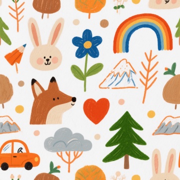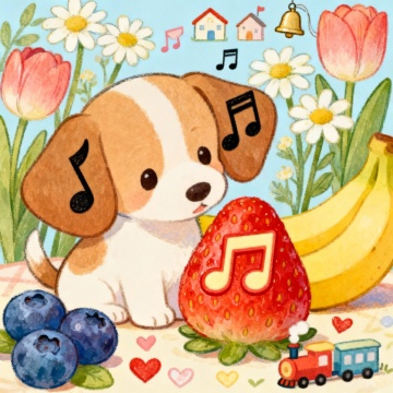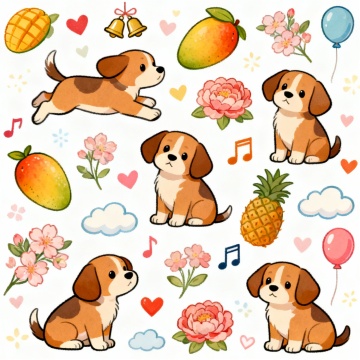 制作印花卡通图案,主体是可爱小狗,多动态,搭配三个以上辅助元素并且元素中要有水果 花朵,小元素五个以上多种多样不要重复生成十张