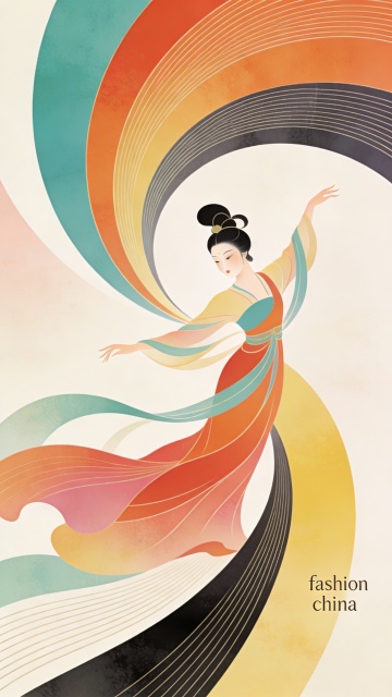矢量插画,抽象线条与曲面线条,线条画,柔美色块构成,极简主义,多巴胺色系,线条设计叠加多个不规则弧形色块武则天跳舞裙摆摇曳生姿柔美的轮廓,惊鸿舞,自然,纹理,装饰,超现实派,具有先锋艺术、时尚字体主标题极小英文“fashion china”作为点缀、大师构图,极简海报,高清画质,大师作品,获奖海报。国风背景
