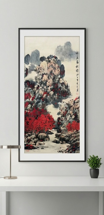 水墨山水,古典中式风格,淡雅悠远,山石树木相映成趣。