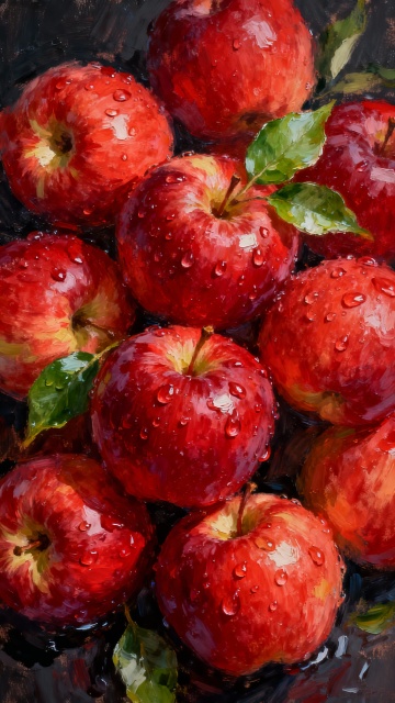 一堆新鲜饱满的红色苹果,表面覆盖着晶莹的水珠,带着翠绿的叶子,采用印象派油画风格,色彩浓郁鲜艳,笔触厚重富有质感,光影朦胧柔和,背景为深色,突出苹果的鲜活与水分感,构图紧密饱满,充满自然生机与艺术氛围。