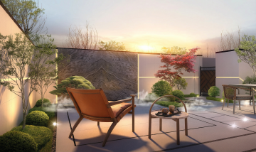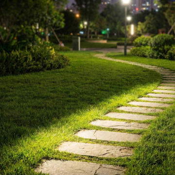 一张展现现代园林景观设计的摄影照片,画面主体为一条由浅色石材铺设而成的宽阔台阶,台阶呈折线形向上延伸,每级台阶边缘嵌有小型圆形地灯。台阶两侧是修剪整齐的绿色灌木和多样化的绿植,形成自然的绿色边界,植物种类包括深绿、浅绿及少量紫红色 foliage,呈现出生机盎然的层次感。整体色调以自然的绿色和石材的暖灰色为主,搭配阳光照射下形成的清晰光影效果,营造出宁静、整洁且富有设计感的氛围。采用高角度俯拍视角,突出台阶的纵深感和几何美感,构图遵循三分法原则,台阶作为视觉引导线贯穿画面中央,两侧绿植形成对称平衡。画面清晰锐利,细节丰富,展现出石材的纹理质感和植物的自然形态,整体风格偏向现代简约的景观设计美学,传递出舒适、有序且亲近自然的空间感受。