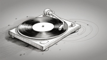 极简主义风格海报,以白色为背景,中央是一个黑色同心圆线条环绕的留声机唱片,唱片中心为鲜艳的蓝色圆形,唱片边缘连接着黑色的唱臂,周围散布着多个大小不一的黑色音乐音符,整体构图简洁对称,线条流畅,视觉层级清晰,色彩对比鲜明,传达出音乐主题的简约现代感。
