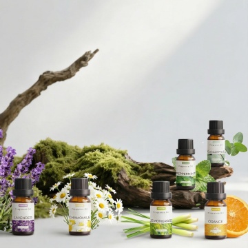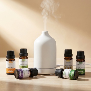 帮我将图1到图6中的精油瓶,随意摆放在一个白色台面上,旁边需要放着正在运作的香薰机,其中有两瓶精油瓶是要求侧着摆放,图片的背景是渐变的,图片要求尺寸是1:1的,要求精油瓶瓶身的标签纸不要有任何改动