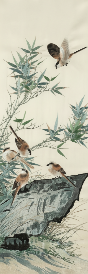 中国工笔画风格,淡雅米黄色背景,中央圆形留白区域,右侧伸出枝干遒劲的玉兰花枝,枝头点缀绽放的白色玉兰花与嫩绿新叶,三只色彩明快的小鸟栖息于枝头,另有一只小鸟展翅飞于圆形区域左下方,线条细腻流畅,色彩柔和温润,构图空灵简约,充满传统古风韵味与宁静雅致的意境。