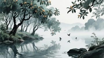 水彩与水墨交融的插画风,朦胧雨雾中白墙黛瓦静立湖畔,柳枝轻拂,光影点点,营造出静谧梦幻的中式意境。