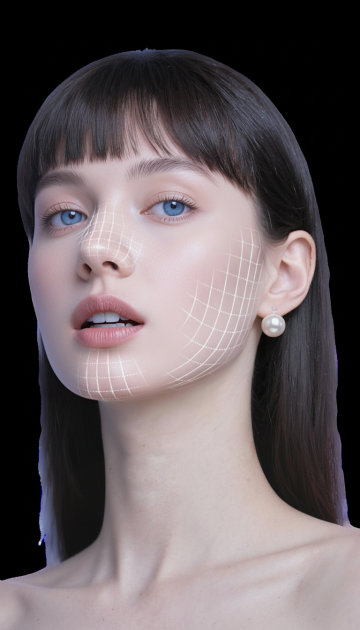 侧脸向上扬起的女性,双眼轻闭,深棕色头发优雅挽成低发髻,面部覆盖着由发光线条构成的网格,网格节点处有闪烁的白色光点,肌肤呈现出极致细腻、光滑、通透的质感,整体画面采用纯净的白色背景,光线柔和均匀地洒在人物轮廓上,营造出科技感与自然美的完美融合,突出皮肤的健康光泽与精致纹理,氛围宁静、高端且富有未来感。
