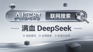 这是一张潮酷霓虹风的 AI 产品宣传图,采用左图右文构图。左侧视觉核心是:一个由霓虹灯管勾勒出的立体 “A” 字母,字母表面流淌着渐变的蓝紫色光效,周围环绕着扭曲的霓虹光带与破碎的像素粒子,背景为纯黑色,点缀着星星点点的青色光点,营造街头潮酷与未来科技碰撞的氛围。右侧是巨大醒目的白色无衬线字体 “AI 实时联网搜索”,下方配米黄色矩形条幅 “满血 DeepSeek”,再下方是浅金色小字 “语音提问 全网搜索 快速出结果”,信息层级分明。整体色调以纯黑为底,辅以霓虹蓝紫、荧光青、亮白及暖金,形成强烈的视觉冲击感,风格为街头潮酷与科幻霓虹融合,光影炫酷张扬,细节充满个性,适用于 AI 产品的年轻用户群体推广与社交媒体传播场景。