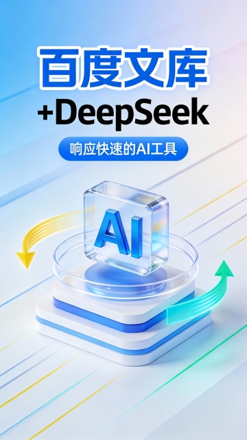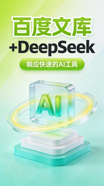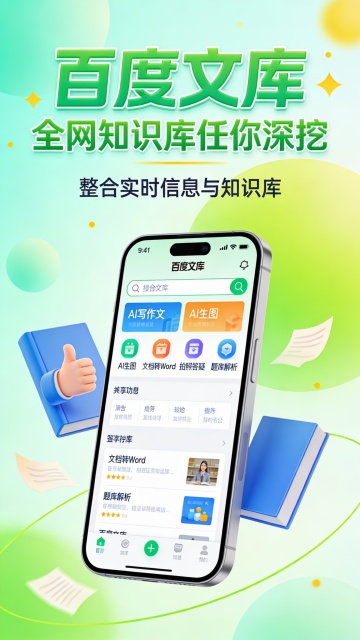 这是一张竖版手机应用推广广告图,采用清新活力的扁平化插画风格。主色调为薄荷绿与亮绿色渐变背景,搭配白色、黄色点缀,营造轻松高效的科技感。画面中心是一部被双手握持的智能手机,屏幕清晰展示“百度文库”App界面,包含“AI写作文”、“AI生图”、“文档转Word”等丰富功能图标及搜索栏,屏幕顶部显示“学习模式”标识。上方是超大号绿色立体字“百度文库”,配以“全网知识库任你深挖”主标语,下方辅以“整合实时信息与知识库”的说明文字,并加入点赞手势和两本蓝色书本作为装饰元素,书本旁点缀铅笔、笔记本迷你图标。构图上,手机居中突出,文字分层排布于顶部与中部,视觉引导流畅。背景运用柔和的圆形色块与动态曲线,增强空间感与动感。整体设计强调信息密度与视觉亲和力,旨在直观传达产品功能强大、操作便捷的核心卖点。