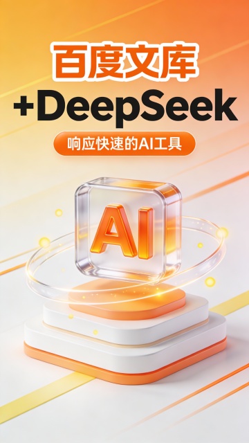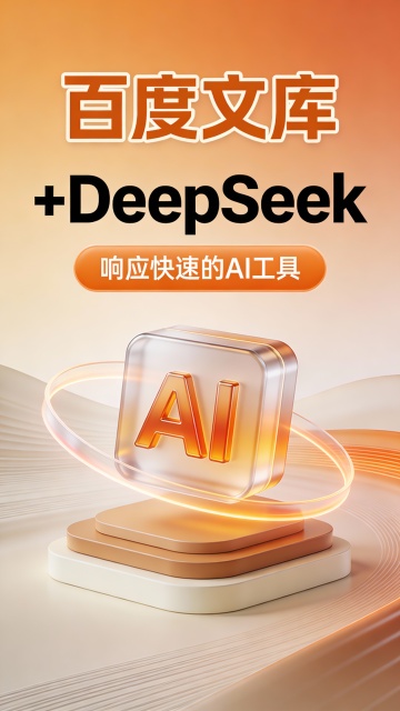 这是一张竖版科技感广告图,采用现代3D玻璃拟态与微立体设计风格,主色调为渐变浅蓝与白色,辅以亮黄、青绿线条点缀,营造清新、高效、智能的视觉氛围。画面顶部是超大号蓝色粗体“百度文库”,带白色描边,下方紧接黑色“+DeepSeek”字样,字体厚重有力且带轻微阴影增强立体;其下是一个蓝色圆角矩形按钮,内嵌白色文字“响应快速的AI工具”。视觉中心是一个悬浮的3D AI图标:主体为半透明玻璃质感方块,内嵌立体蓝色“AI”字母,置于多层白色与蓝色渐变基座之上,基座带细磨砂纹理,周围环绕双层流动透明环形光带,内层亮蓝外层浅绿,象征数据流转与智能响应,图标底部投射淡蓝柔影强化悬浮感。背景为柔和的蓝白渐变,搭配抽象斜向动态线条,叠加极淡网点纹理提升细腻质感,增强空间纵深与科技动感。构图上文字居上、图形居中,信息层级清晰,视觉引导流畅,整体强调产品融合创新、响应迅捷的核心价值,适用于AI工具类品牌推广。