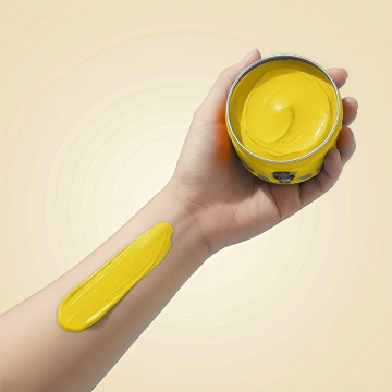生成一张手拿产品,在手臂内侧涂上一条蓝色海洋友好防晒泥的图片,1:1,防晒泥产品使用图,电商图