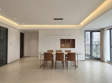 极简主义风格的室内背景,柔和的米白色墙面搭配浅木色人字拼地板,自然光透过米白色半透明窗帘洒入,营造出明亮通透、宁静舒适的氛围。房间中央摆放着一组不同设计的浅灰色布艺沙发,搭配深绿色和浅蓝色的几何图案靠垫,沙发前是一张椭圆形的黑色大理石茶几,上面放置着一个造型简约的玻璃花瓶,插着几支干枯的芦苇。墙上悬挂着一幅抽象风格的装饰画,画面以深蓝色和金色为主色调,呈现出流动的线条感。房间另一侧的墙角摆放着一盆高大的琴叶榕,种植在一个哑光白色的陶瓷花盆中。天花板上安装着一盏造型独特的黑色金属吊灯,灯光温暖柔和。整个空间的配色以低饱和度的灰色、蓝色和绿色为主,搭配原木色的自然质感,展现出简约而不失高级感的现代设计美学。