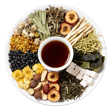 以真实拍摄风格,描绘立起来的正面白色圆盘,圆盘中装有干的药材,药材包括枳椇子、马齿苋、覆盆子、余甘子、布渣叶、鲜芦根、昆布、藿香、鲜白茅根、山楂、甘草。盘子中间放一杯颜色深褐色的茶汤,采用精修方式呈现、光线明亮,药材摆满圆盘,圆盘显示完整,严格按照文字要求的中药材显示,不要添加其他药材