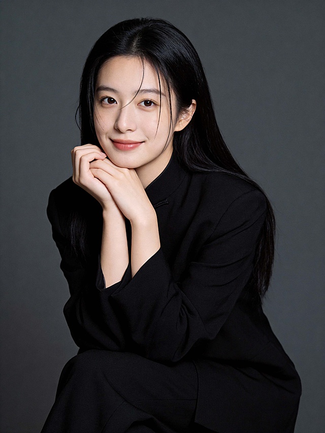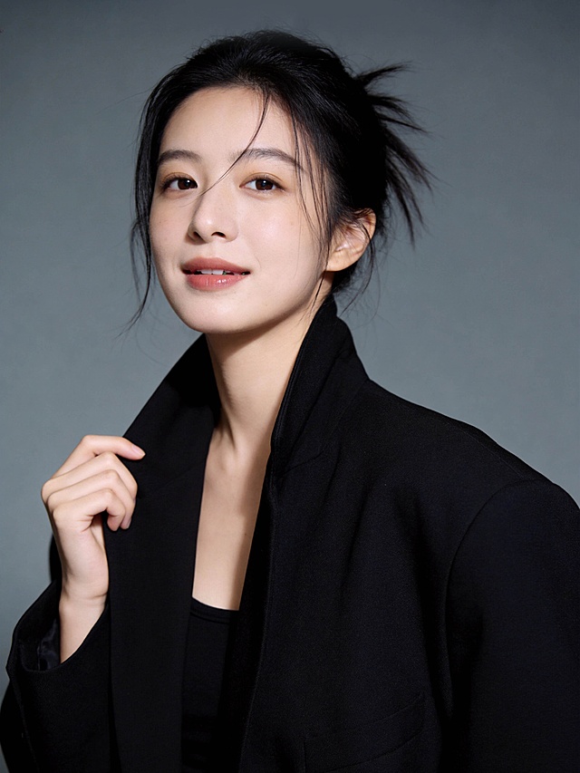 保留第一张图人物脸型、年龄特征生成标准纯正面胸像肖像照(特写);参考第二张图的人物占位和比例,头顶至上边缘有3%的距离,50mm标准焦段,人物位于画面中心,为聚焦核心,居中构图,占画面75%空间;平视视角(镜头与人物眼部平齐);入境范围头部至胸部区域,颈肩结构准确合理,姿态自然;中近景氛围感肖像,淡妆,冷调白皙,极淡裸粉哑光眼影打底,极细内眼线填充睫毛根部,大直径深棕色带细微高光点的自然款美瞳;边缘模糊无生硬轮廓;唇妆:粉调草莓红镜面水光唇釉;肤质白皙细腻;上身着极简白色西装外套(含5%桑蚕丝提升柔光质感),下搭黑色垂感中长裙(长度及膝、面料哑光);造型:中长自然波浪发(发尾微卷、发色深棕);妆面:韩式精致浓妆(底妆为磨皮柔焦质感、肤色均匀提亮至冷调白皙,眼妆为大地色渐变+纤长卷翘睫毛,唇妆为哑光豆沙色,腮红轻扫苹果肌提升气色);姿态:坐姿;双臂自然交叉搭于腿面,右手自然垂落于裙摆处(手指放松微张),左手轻搭右前臂,头部微侧,面部转向镜头,浅淡微笑,眼神直视镜头(目光坚定澄澈),表情自然、嘴角轻扬;气质:整体呈现自信温婉+时尚柔美的融合感;影棚柔和侧光(细腻明暗层次),白皙光泽+深豆沙红唇妆,高清32K细腻画质。温柔慵懒松弛氛围;光线均匀柔和,画质清晰,表情自然,头部发型完整,去除人物之外的所有元素;美颜轻度磨皮,影棚布光(主光来自画面前方),明暗过渡柔和,背景光线均匀,强化色彩对比的高级感。简约中深灰度纯色背景(呈现均匀柔和质感),极简干净,严格按照第一张图内容生成。详情