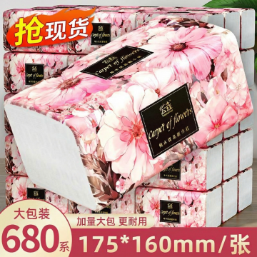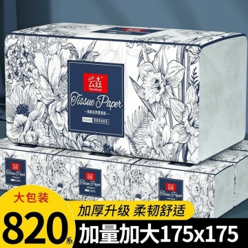 生成一张纸巾电商主图。复制多个主体堆叠在展台上,背景为虚化客厅,自然打光。商品卖点“原生木浆 亲肤无刺激”。画面下方为黄绿渐变配色文本框,展示卖点信息“24包/箱 实惠耐用湿水不易破”。