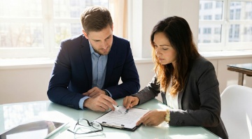 写实风格的办公场景,明亮自然光从窗外洒入,木质办公桌表面光滑有反光,桌面上铺展着带有蓝色和橙色数据图表的文件,几位穿着深色西装和浅色衬衫的商务人士正在用钢笔指点讨论图表,周围散落着计算器、笔记本和钢笔等办公用品,整体氛围专业、专注且富有合作气息,构图聚焦于手部动作与数据图表的互动,光影柔和,色彩以原木色、蓝色、白色和深色西装的灰色为主,营造出真实且高效的办公环境。
