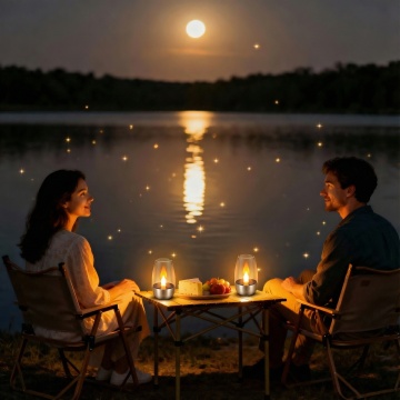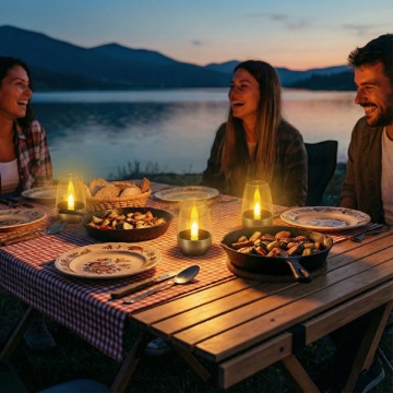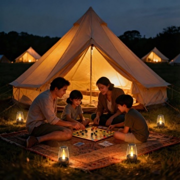 傍晚户外露营场景,白色帐篷下人们围坐在餐桌旁聚餐,帐篷顶部和四周悬挂着温暖的串灯,周围点缀着点燃的蜡烛和灯笼,营造出温馨浪漫的氛围,绿色草坪上散落着舒适的坐垫和靠枕,树木的枝叶在灯光下形成柔和的阴影,整体色调温暖,光影层次丰富,充满自然惬意的露营生活气息。