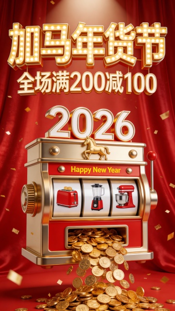 生成马年新春家电竖版促销海报,主色调正红 + 烫金:核心布局:多层红色发光展台(带霓虹灯带),台上陈列家电组合 —— 左侧白色扫地机器人、中间黑色投影仪、右侧棕金色电压力锅,展台旁点缀金色马形装饰、红色马年剪纸。部 “马迎新春” 立体大字(金红渐变 + 金属光泽),下方红绸按钮配 “假期囤货低至五折” 文案。景红底叠加金色祥云、飘飞金片,底部铺红色水纹肌理,整体风格喜庆华丽,突出家电年货的高端促销感。展台灯带呈霓虹光效,光影明暗对比强烈。