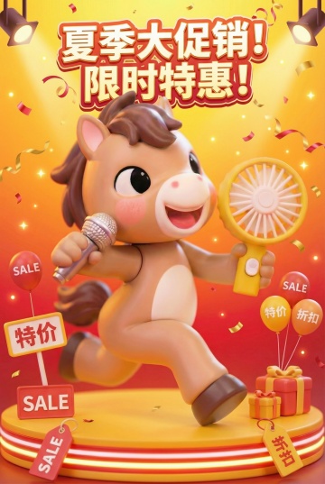 软3D风格卡通小马拟人化设计,手持麦克风与风扇,喜庆氛围浓厚,搭配促销元素与节日灯光,传递夏季大促销的欢乐与优惠感。