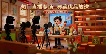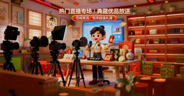 软3D风格卡通马拟人形象,戴耳机持麦克风热情开麦,手持新年礼盒,喜庆红蓝配色,营造节日促销氛围,融合直播场景与塑料质感细节。