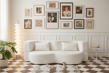 动漫风格插画,明亮自然光从左侧照射,米白色墙面,墙上挂着棕色木质相框的抽象装饰画,画中是米色和棕色的柔和曲线,下方是米白色布艺单人沙发,沙发上放着一个橙色靠垫,沙发左侧有一盆大型绿植,叶片宽大翠绿,放置在白色花盆中,沙发右侧地面上有一个灰色和黑色相间的小型家用电器,浅色地毯铺在人字形拼花木地板上,整体画面温馨舒适,色彩柔和,线条流畅,细节精致,构图平衡。