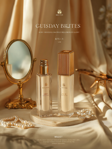 主题:美妆品牌“雾屿”的哑光丝绒唇釉产品海报;风格:法式复古轻奢风,融合油画质感的细腻笔触与现代极简的构图逻辑,画面层次分明且突出产品主体;色彩:主色调为勃艮第红(#800020)+奶油米白(#F5F0E6)+墨黑(#1A1A1A),点缀鎏金(#D4AF37)作为细节提亮色,色彩饱和度低但对比鲜明;场景:复古雕花梳妆台上摆放着三支雾屿哑光唇釉,唇釉管身是磨砂玻璃材质搭配金属细管,旁边放着复古黄铜化妆镜与珍珠发夹,背景是浅米色丝绒布帘,柔和的暖调侧光透过复古窗格洒在唇釉上,形成细腻的光影渐变,画面留白25%用于放置logo和文案;画面为竖版美妆电商海报,分辨率300dpi,唇釉膏体的哑光丝绒质感真实,玻璃管身的磨砂纹理清晰,整体氛围优雅复古
