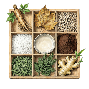 一张富有创意的商业产品摄影图,纯正俯视视角,画面左半部分,呈半扇形地摆放着8种天然食材,有赤小豆、薏苡仁、燕麦片、莲子、芡实、茯苓、新鲜的山药片、橘皮。画面光线明亮柔和,色彩自然,食材的质感真实,构图干净且富有设计感,高清细节,背景方便抠图