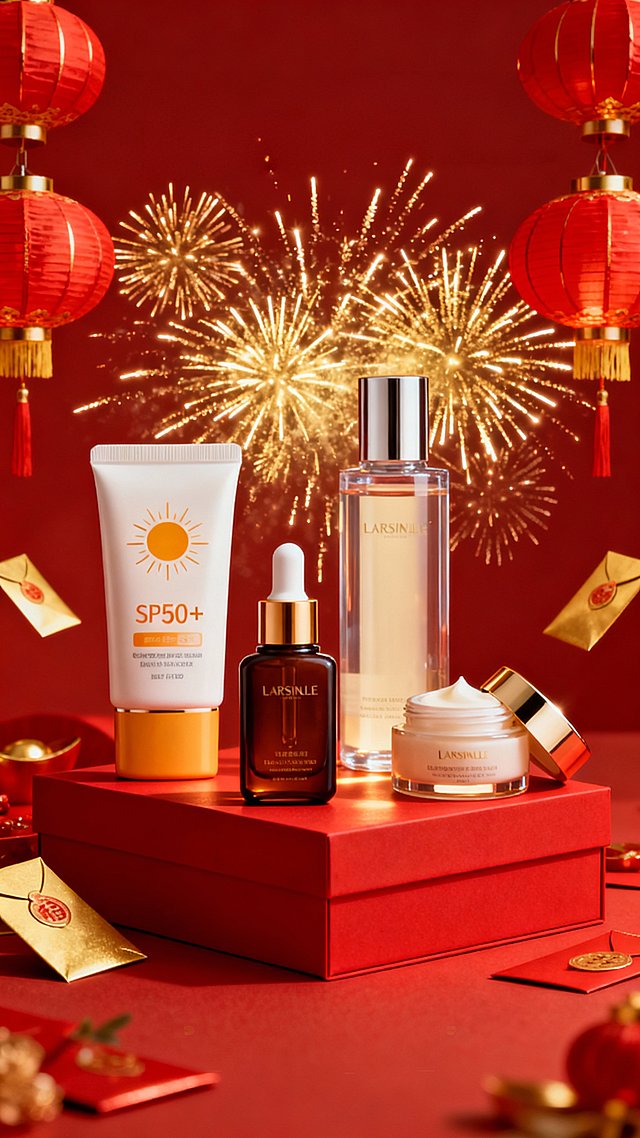 仰视角度拍摄的主体陈列在红色哑光礼盒上的特写,占画面五分之一。背景是红色礼盒呈倾斜放置在主体背后,突出商品质感。周围点缀金箔、烟花装饰,背景为暗红色到红色的上下渐变。详情