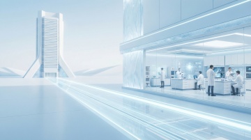 超现实主义风格的现代实验室内部场景,以纯净的白色为主色调,搭配浅灰色的金属框架和玻璃隔断,营造出极度干净、规整、无菌的氛围。天花板采用白色方形扣板设计,内嵌多排明亮的线性LED灯带,光线均匀柔和地洒落在整个空间,地面为光滑如镜的白色环氧树脂材质,清晰地反射出天花板和设备的光影。实验室中央是宽敞的通道,两侧整齐排列着白色的实验台,台面光滑洁净,下方配有带金属拉手的白色柜门。实验台上和后方的白色金属架上有序摆放着各种现代化的实验室设备,包括烧杯、试管架、显微镜、离心机和分析仪器等,所有物品均摆放得一丝不苟。远处的背景墙上有大面积的玻璃窗,透进柔和的自然光,进一步增强了空间的明亮感和通透感。整体构图采用对称式布局,视觉引导线从前景地面延伸至远处的窗口,形成强烈的纵深感和空间感。画面中没有任何多余的装饰和杂物,信息传达简洁高效,整体设计极具现代感和科技感,非常适合作为需要体现专业、严谨、纯净氛围的背景图像。