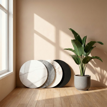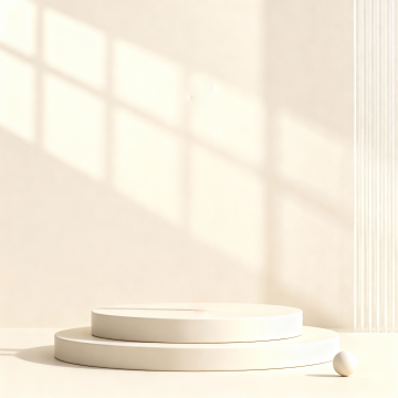 一个具有浓郁中式风格的室内场景,画面整体以米白色和原木色为主色调,营造出宁静、雅致、禅意的氛围。柔和的自然光从上方斜射下来,在背景墙上形成淡淡的光影层次,光线明亮且柔和,阴影过渡自然。画面中央偏下位置有一个圆形的原木色展台区域,展台表面光滑,边缘圆润。背景由左侧的中式木格栅、中间的圆形素色背景板和右侧的竖条木格栅组成,木格栅线条简洁规整,圆形背景板干净素雅。左侧展台旁摆放着一盆翠绿的竹子,叶片舒展,增添了生机与自然气息。整个画面构图注重留白,留空区域约占70%,形成了疏朗有致的视觉效果,展现出中式美学中“少即是多”的意境,整体风格统一、和谐,给人一种静谧、舒适、古朴而不失现代感的视觉体验。