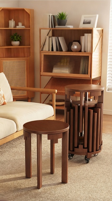 一张高质量产品展示图,白色纯净背景,主体为一张设计感十足的木质桌子。桌子采用深色实木材质,表面呈现出自然流畅的山形木纹和独特的树瘤纹理,木纹走向富有变化且清晰可见,木材质感真实细腻,带有天然的细小毛孔和轻微的打磨痕迹。桌面边缘设计为柔和的弧形圆角,桌腿为简约的细线条方形结构,与桌面形成稳固连接,整体风格简约现代。光线从左上方柔和照射,在桌面形成自然的明暗过渡,左侧边缘有轻微的高光,右侧和底部形成柔和的阴影,增强了物体的立体感和空间感。画面构图采用经典的产品摄影视角,桌子居中放置,占据画面大部分空间,底部边缘略微裁剪,突出木材的质感和纹理细节,整体给人一种高端、简约、自然的视觉感受。